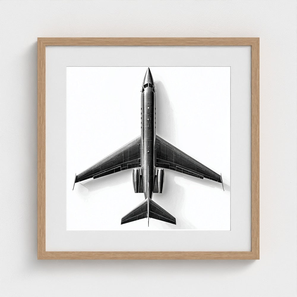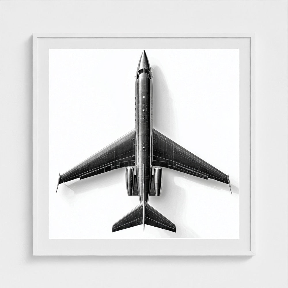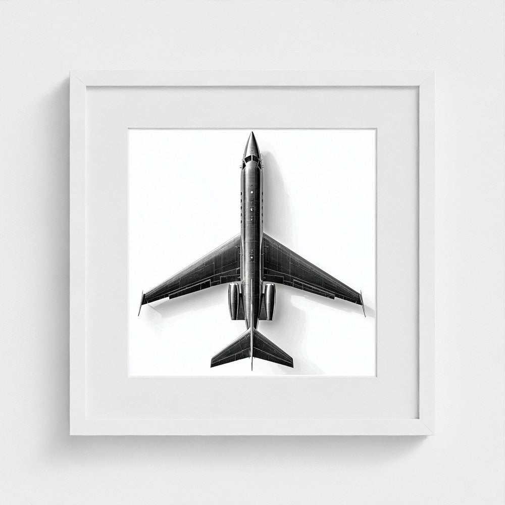 Elevate your space with this striking top-down private jet art print — a modern, photorealistic aviation photograph designed to bring clean, architectural drama to any room. The bright white background isolates the aircraft, highlighting its precise lines, metallic form, and bold shadow for a minimalist, gallery-ready look. Perfect for offices, living rooms, studios, or aviation-themed interiors, this refined airplane wall art delivers a crisp, modern statement.