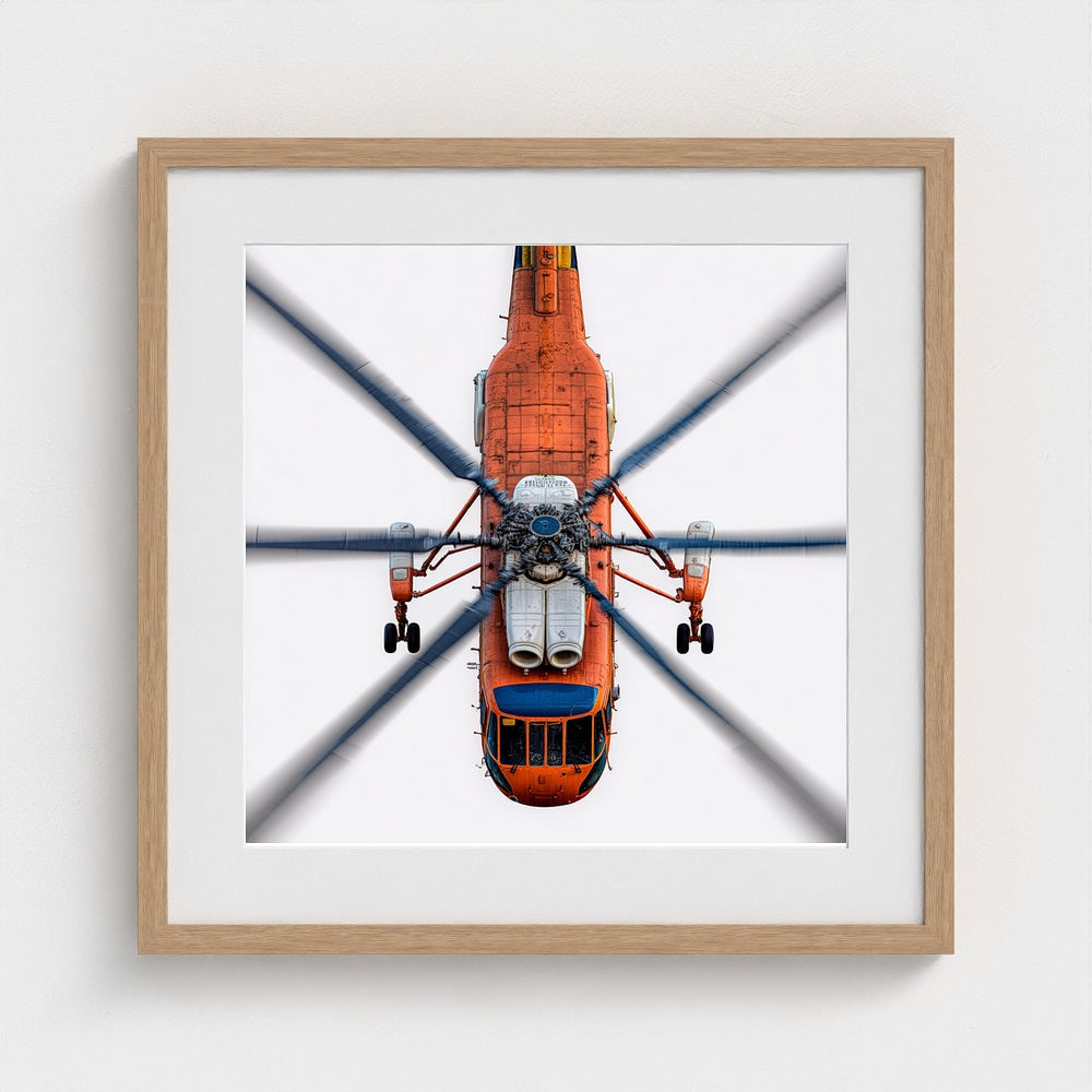A striking top-down perspective that blends precision, power, and contemporary design. This Large Orange Helicopter Aerial Photograph captures a vivid aircraft centered against a crisp white ground, its spinning rotor forming a clean geometric X that feels sculptural and cinematic. The bold orange, paired with Studio Stevie’s signature clean composition, creates aviation art that commands attention in offices, living rooms, garages, and modern industrial spaces.